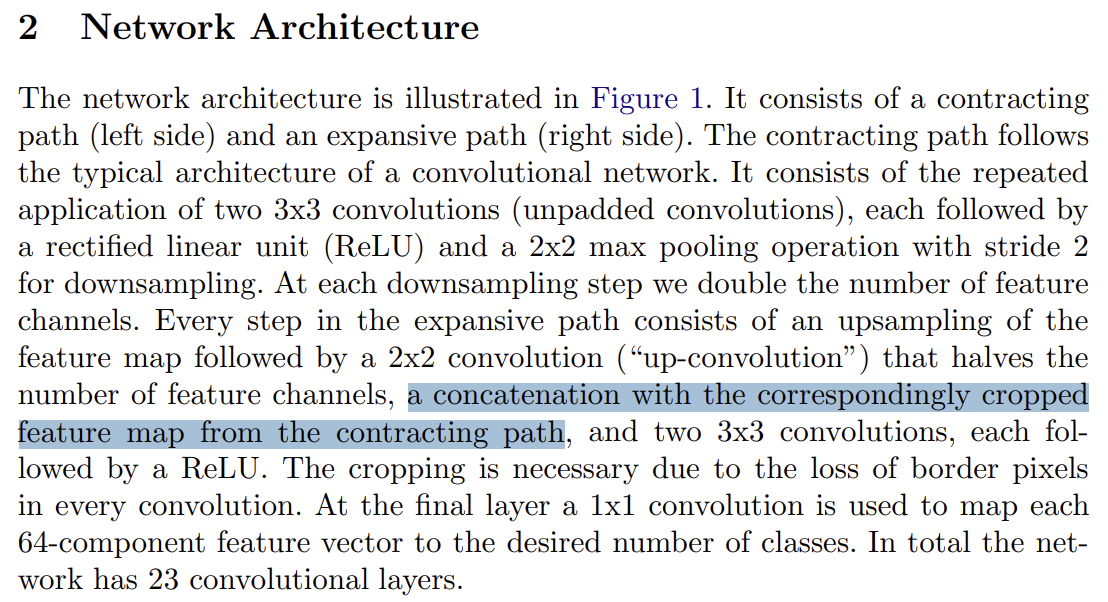 인코더와 디코더를 copy and crop으로 연결하는 게 핵심이라고 한다. 이걸 skip connection 이라고 한다네. 저 회색 화살표가 스킵커넥션인 것 같다. 깊이가 5단계로 되어있는데 마지막 단계 제외하고 다 연결하는 것 같다.