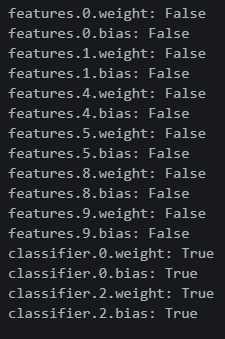 startswith('features') 와 requires_grad = False 를 이용해 features에 속하는 부분을 재학습되지 않도록 프리즈한다.