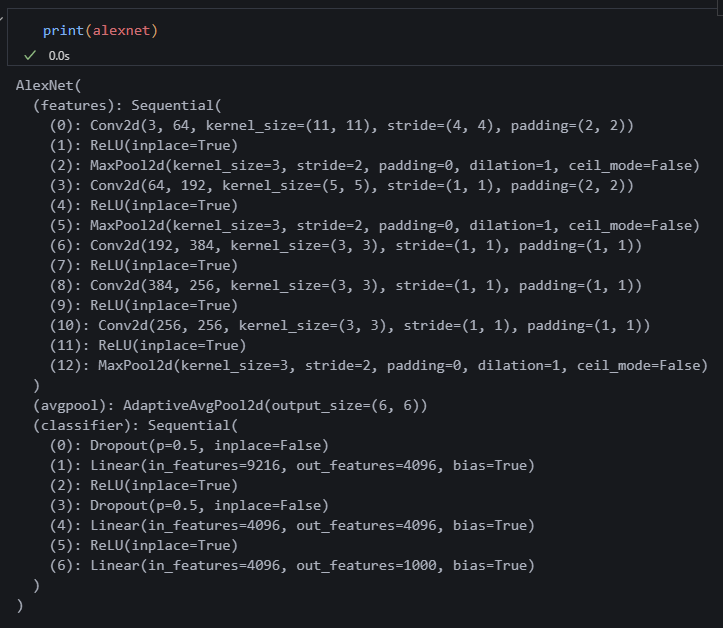 알렉스넷 지정한 변수를 찍으면 __init__ 부분이 나오는 것 같다. 즉, 내가 모델을 만들진 않았지만 모델의 내부를 볼 수 있다는 뜻.