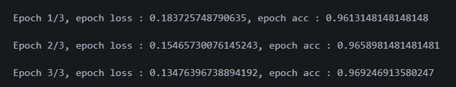 print(f"Epoch {epoch+1}/{num_epochs}, epoch loss : {epoch_loss}, epoch acc : {epoch_acc}")