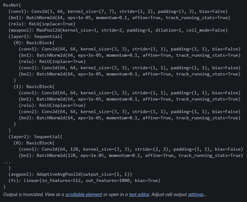 역시 복잡하다. 일단 마지막 (fc): Linear(in_features=512, out_features=1000, bias=True) 이 부분에 아웃피처만 바꾸면 될 것 같다!