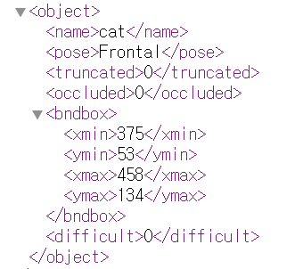 for 루프를 돌면서 object 노드를 찾고, 그 노드에 속한 bnbbox 노드 정보('xmin','ymin','xmax','ymax')를 가져온다.