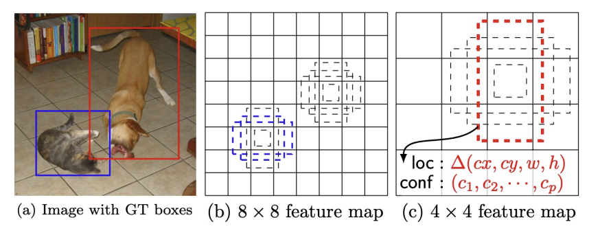 SSD의 특징은 Region Proposal을 사용하지 않는다는 것과, 다양한 크기의 Default Box를 사전 정의해서 오프셋 예측을 한다는 것이다.