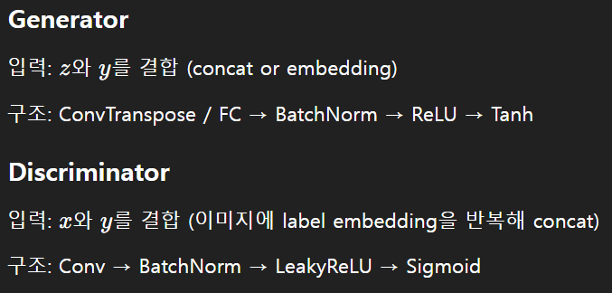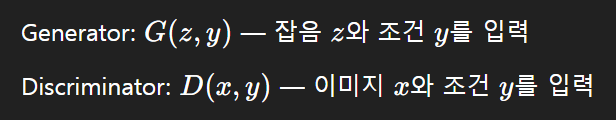 | 생성기 입력 | 잡음 벡터만 입력함 | 잡음과 조건을 함께 입력함 |