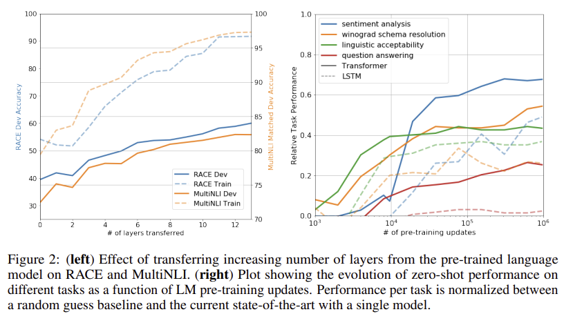 해설: '제로샷' 평가는 미세 조정을 전혀 하지 않은 상태에서 모델의 성능을 측정하는 것임. 이를 통해 GPT-1이 '사전 훈련 과정만으로도 유용한 언어 지식을 습득했음'을 보임. 비록 성능이 높지는 않았지만, 무작위 추측보다 나은 결과를 보여주며 사전 훈련의 효과를 입증함. 이는 모델이 특정 과제에 대한 잠재력을 내재하고 있음을 시사함.
