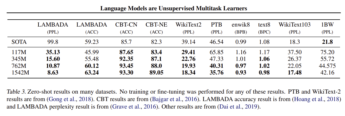 해설: 논문에 따르면, 가장 큰 GPT-2 모델조차도 WebText 데이터셋에 대해 '과소적합(underfitting)' 상태였음. 이는 모델이 훈련 데이터를 완전히 학습하지 못했으며, 모델의 용량을 더 키우거나 더 오래 훈련하면 성능이 더 향상될 여지가 있음을 의미함. 여러 태스크에서 SOTA를 달성했음에도, 훈련 데이터에 대해서는 아직 학습할 내용이 남아있다는 점이 인상적임.