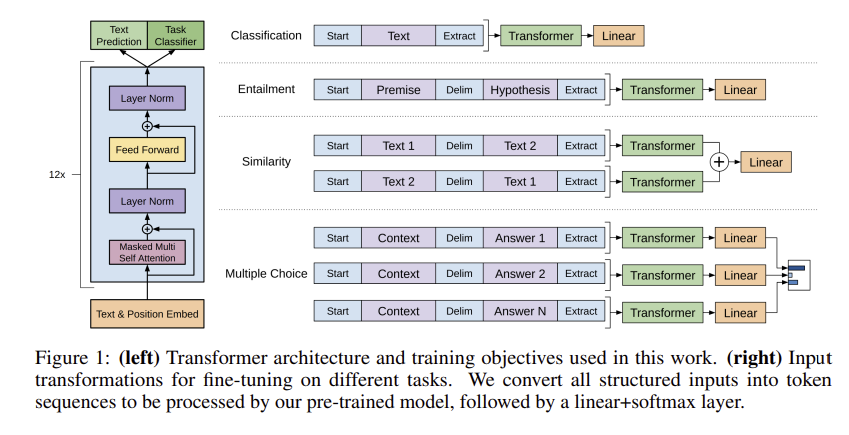 해설: 기존 방식은 주로 사전 훈련된 '단어 임베딩'만을 활용함. 반면 GPT-1은 단어 임베딩뿐만 아니라, 사전 훈련된 '모델 전체'를 직접 미세 조정함. 이로 인해 각 태스크에 맞는 별도의 모델 구조 변경을 '최소화'할 수 있었음. 이는 단일 통합 아키텍처로 다양한 문제에 접근하는 새로운 패러다임을 제시함.