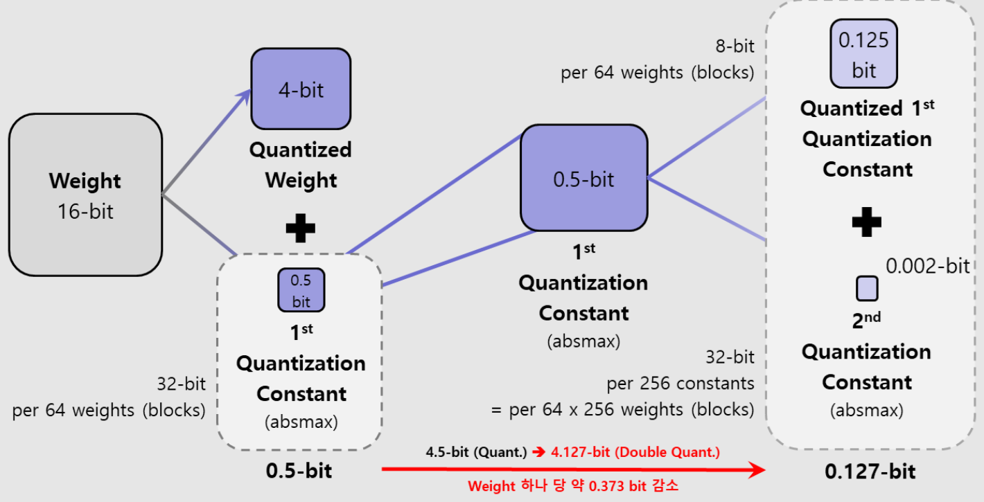 - 양자화 상수를 다시 양자화하는 이중 양자화(Double Quantization) 기법을 사용함