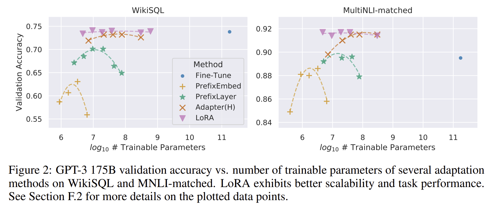 - 다른 경량화 기법들과 달리, LoRA는 학습 파라미터가 늘어날수록 성능이 안정적으로 향상되는 좋은 확장성을 보임