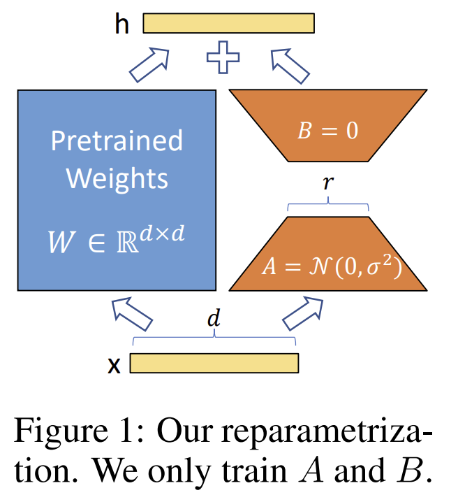 - 모델을 변화시키는 '업데이트 정보'를, 훨씬 작은 두 개의 행렬(A와 B)의 곱으로 분해하여 표현함