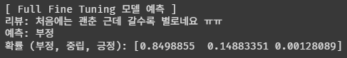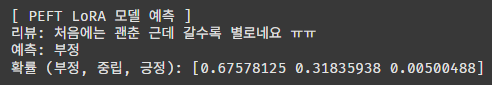 print(f"확률 (부정, 중립, 긍정): {lora_probs}")