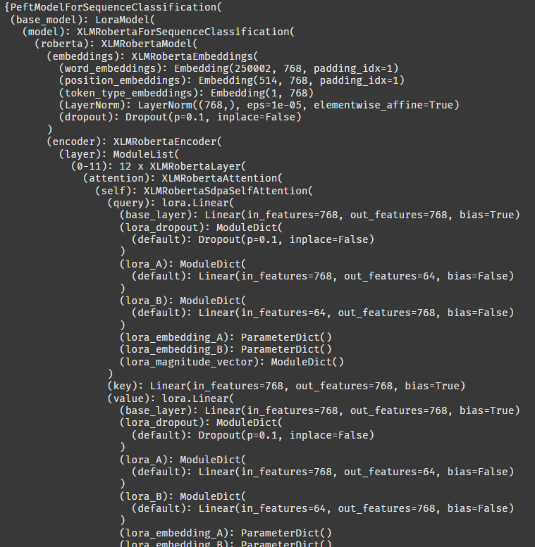 PEFT LoRA 에서는 LoraModel이라는 클래스 안에 XLMRobertaModel이 있는 것으로 보인다.