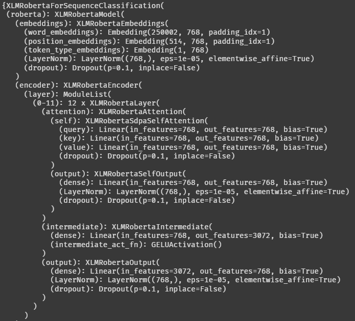 Full Fine Tunning 에서는 XLMRobertaModel이 로드됐다. facebook에서 가져온 모델 이름 그대로 출력되는 것 같다.