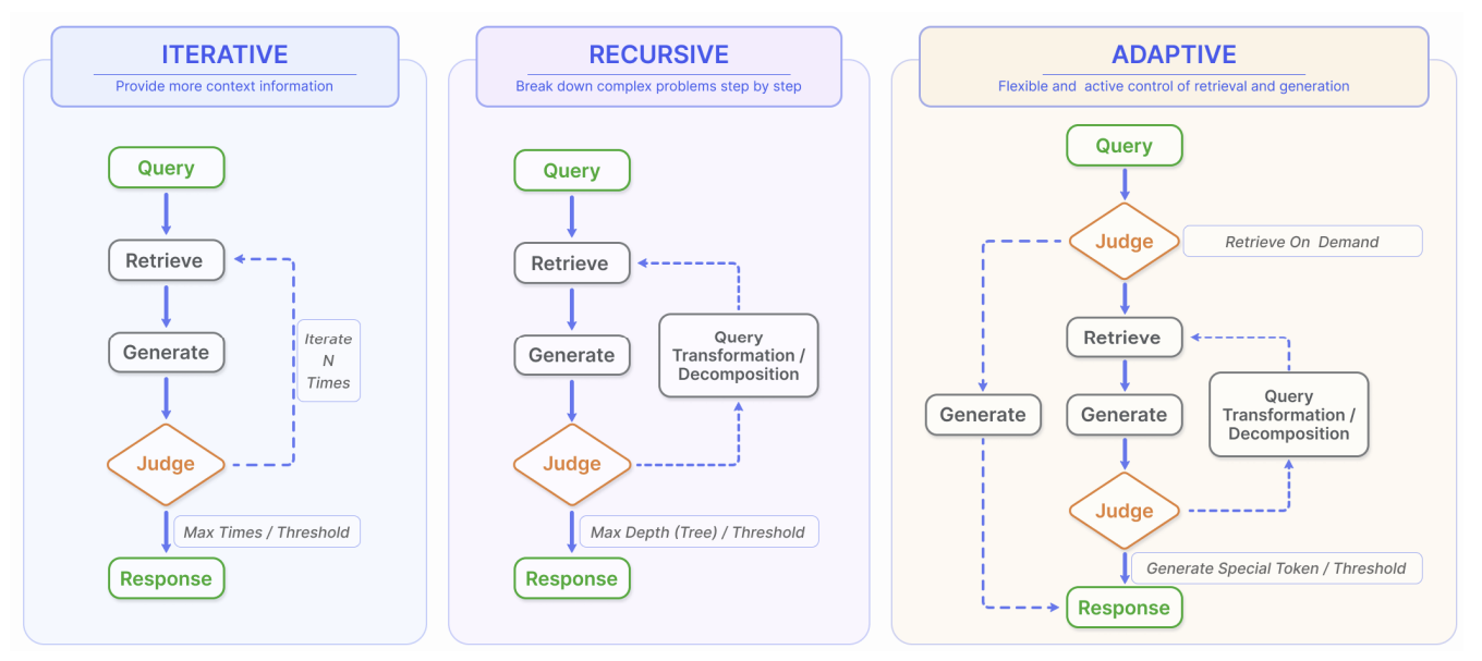 - Adaptive Retrieval: LLM이 스스로 검색이 필요한 순간과 내용을 판단하여 능동적으로 검색을 수행 (e.g., Self-RAG)