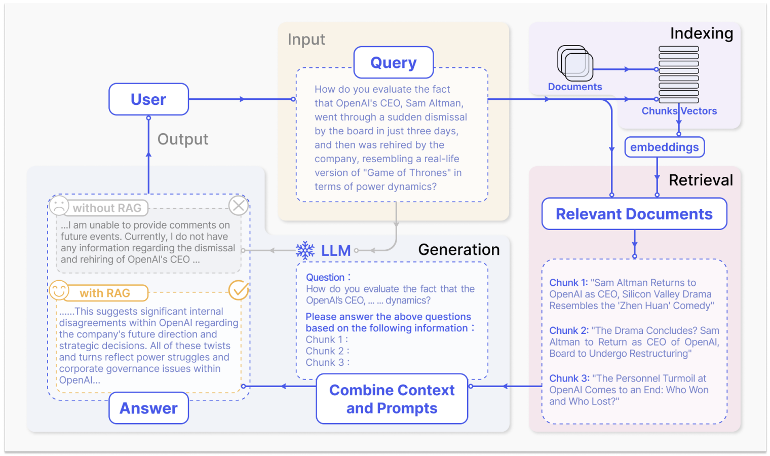 - Naive RAG: '검색-읽기'의 전통적 프로세스를 따르는 초기 단계로, 색인, 검색, 생성의 단순한 구조를 가짐