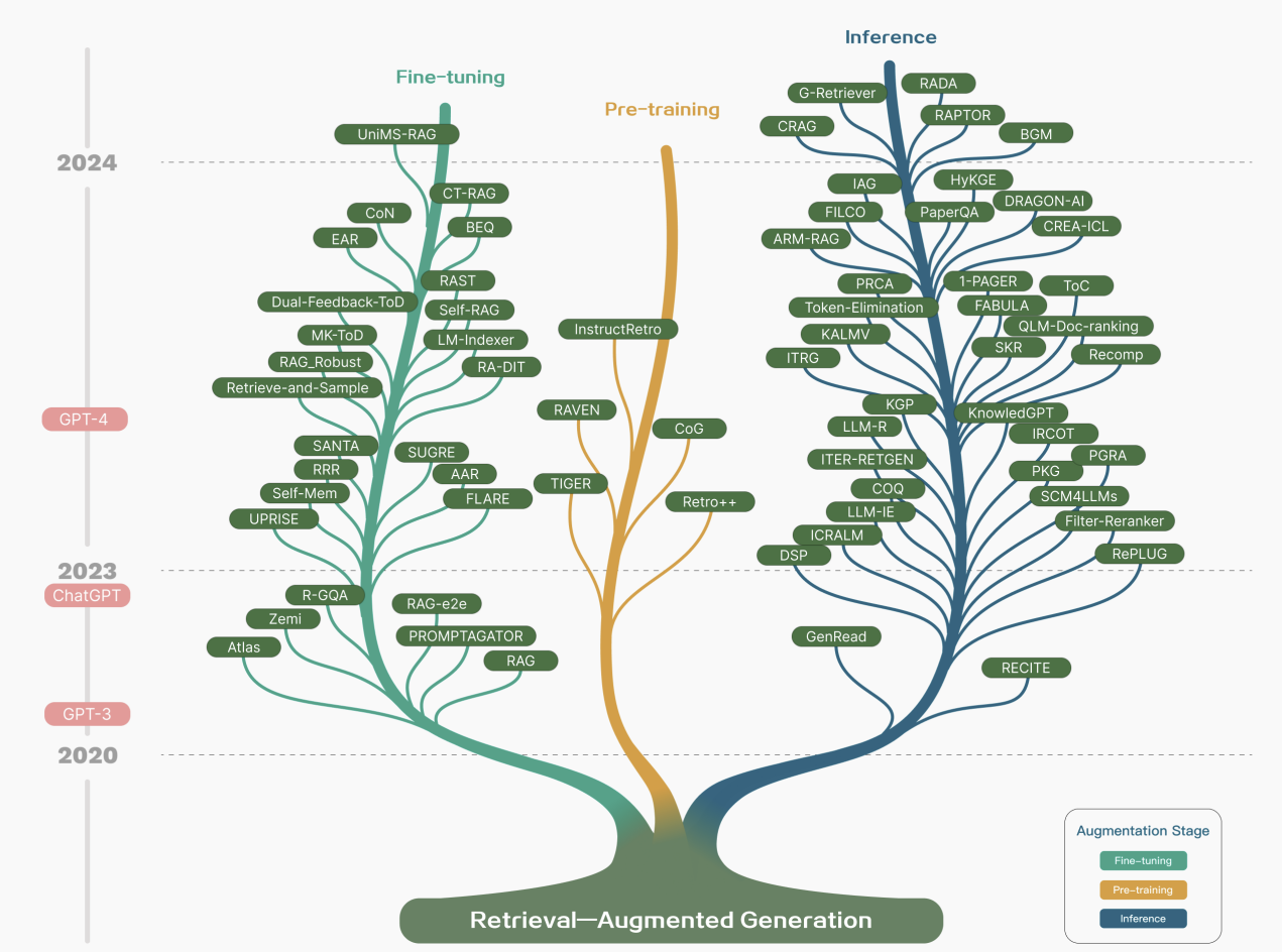 - 증강(Augmentation): 검색 및 생성 과정을 최적화하는 기술들로, 반복적 검색이나 적응형 검색 등 다양한 전략을 통해 시스템 전체의 성능을 향상