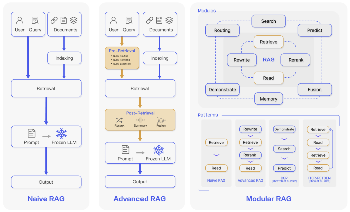- Modular RAG: 검색, 재작성, 재정렬 등 다양한 기능 모듈을 도입하고, 반복적 또는 적응적 검색 같은 유연한 파이프라인 구성이 가능