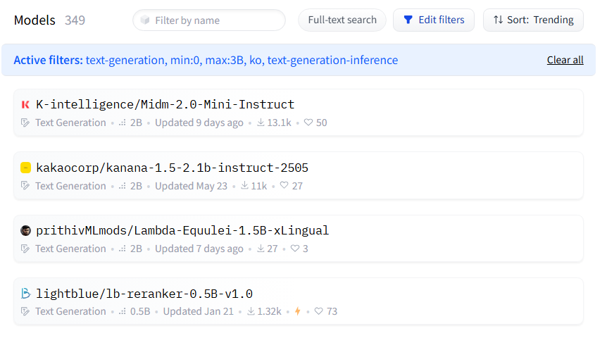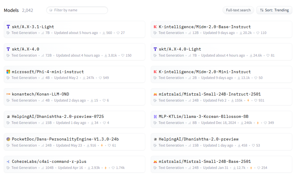 text-generation-inference, Text Generation, korea 필터를 거니까 약 2000개의 모델이 나왔다.