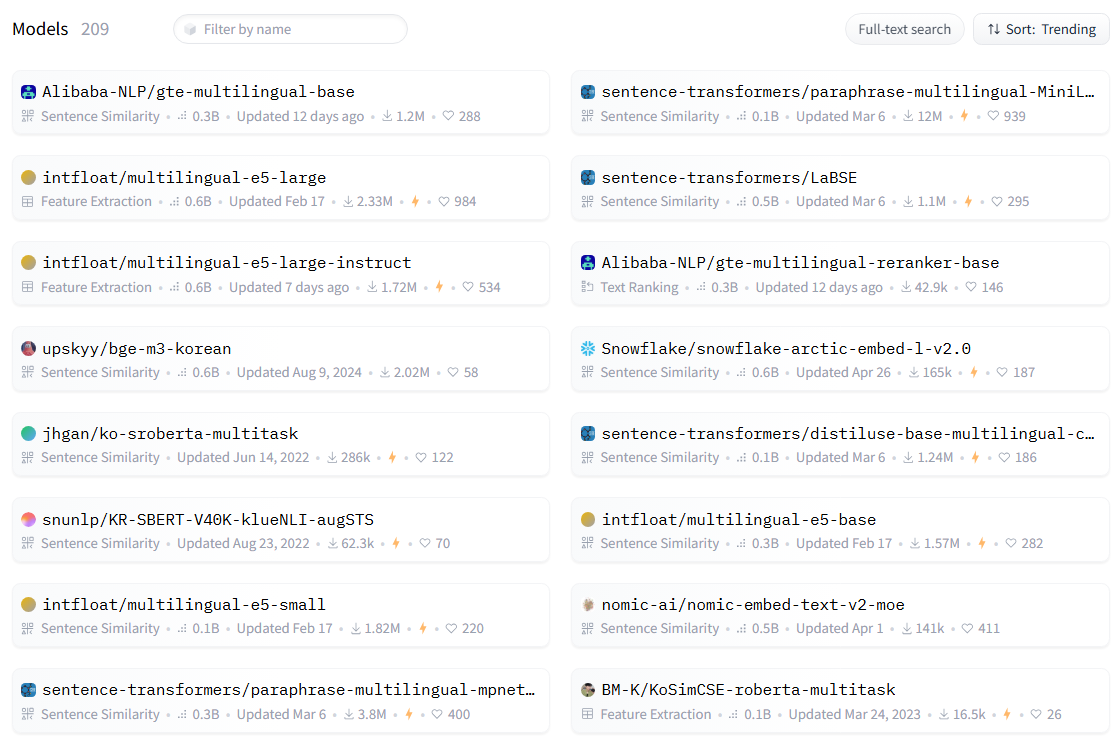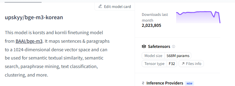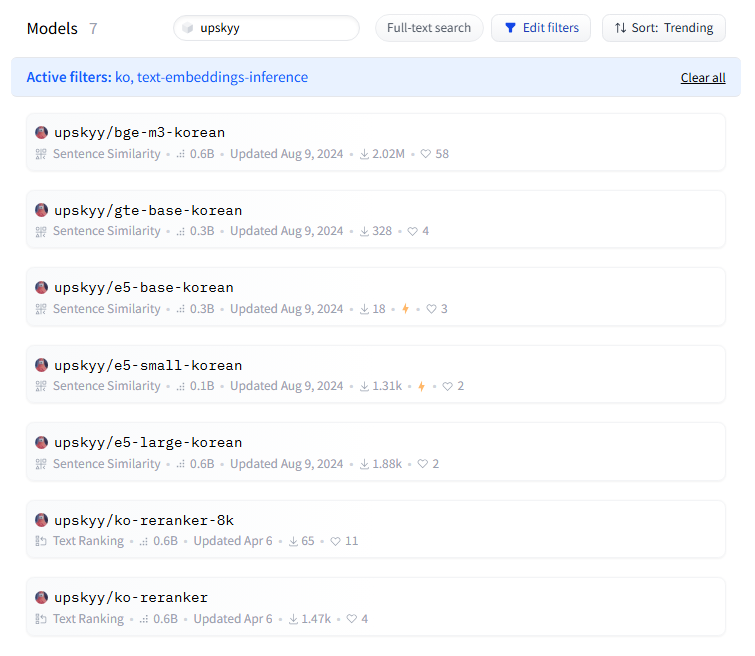 한국어 가능 여부까지 필터를 걸었더니 209개의 모델이 나왔다. 현재 trending인 모델을 훑어보니 upskyy/bge-m3-korean 라는 모델이 눈에 들어온다.