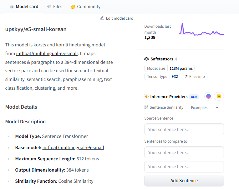 ntfloat/multilingual-e5-small 모델을 파인튜닝해서 만들었다고 한다. 다운로드 수가 낮긴 한데,,, 그래도 같은 사람이 만들었으니까 한번 믿고 써볼까..?