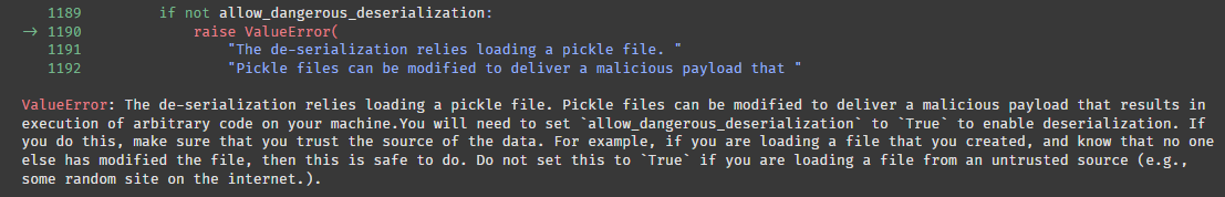 대충 읽어보니 pickle 파일은 악성 코드를 포함할 수 있어서 allow_dangerous_deserialization 을 True 로 주는 코드를 포함해야 로드할 수 있다는 것 같다.