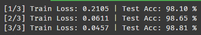 progress_bar.write(f'[{epoch+1}/{epochs}] Train Loss: {avg_loss:.4f} | Test Acc: {accuracy:.2f} %')