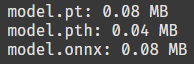 .pth (PyTorch 기본 저장 형식).pth (양자화 된 버전).onnx (ONNX 형식)ONNX 파일을 기반으로 하여 추론 코드를 작성