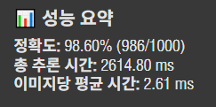 이미지 1000개 추론에 2.6초 걸렸다. 정확도도 파이썬으로 실행했던 것과 비슷하다.