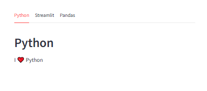 tab1, tab2, tab3 = st.tabs(["Python", "Streamlit", "Pandas"])