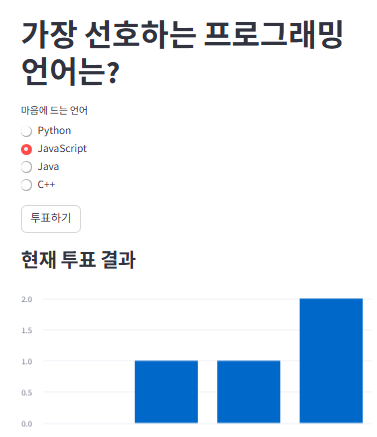 st.session_state.votes = {'Python': 0, 'JavaScript': 0, 'Java': 0, 'C++': 0}