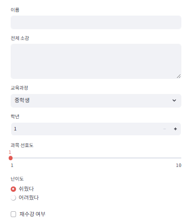 data["preference"] = st.slider(label="과목 선호도", min_value=1, max_value=10)