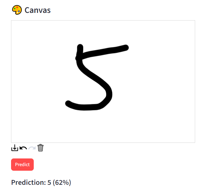 캔버스에 그려진 숫자를 예측하는 로직이다. 버튼을 누르면 데이터를 28x28 흑백 이미지로 전처리한다. 이후 ONNX 모델 세션에 넣어 숫자별 예측 점수를 도출하고, softmax 함수를 통과시켜 가장 높은 값을 argmax로 찾아낸다.