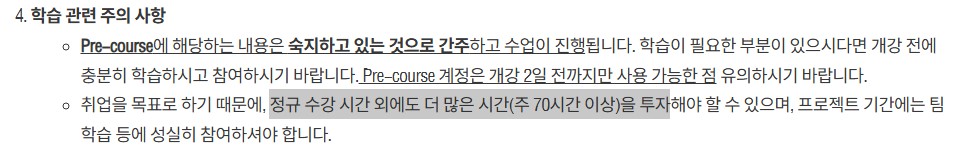 주 70시간 이상 투자해야 한다는 경고문구(?)도 있었다. 하루 10시간씩 5일 하면 50시간인데, 주말에도 각각 10시간씩 할애하거나 주중에 시간을 갈아 넣어야 한다는 것이다.