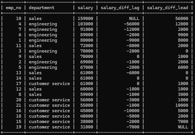 salary - LAG/LEAD(salary) OVER(ORDER BY salary DESC) AS salary_diff_lag,