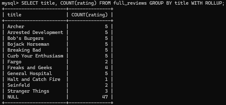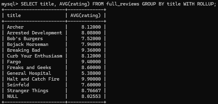 ex) SELECT title, AVG(rating), COUNT(rating) AS review_count FROM full_reviews