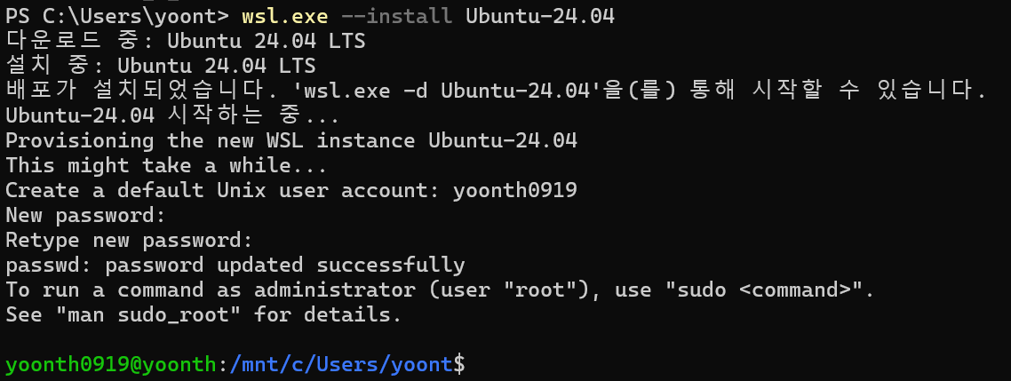 다 설치 되면 아래의 이미지와 같이 뜨게 되고 User account와 password 입력하면 wsl에 접근 가능