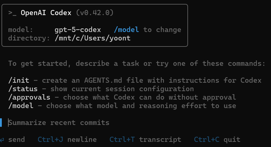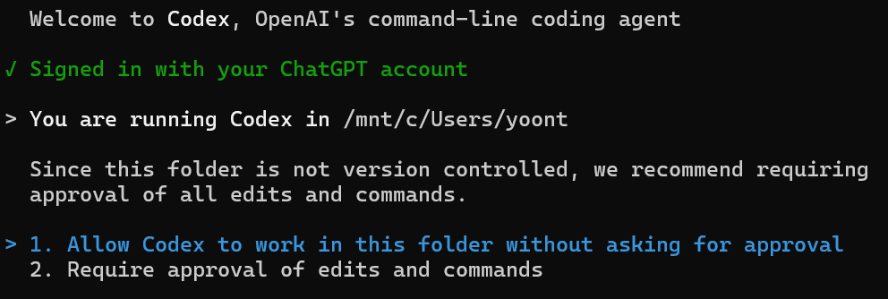 이후에 프로젝트 폴더 경로로 접근 후 codex 실행하여 /init