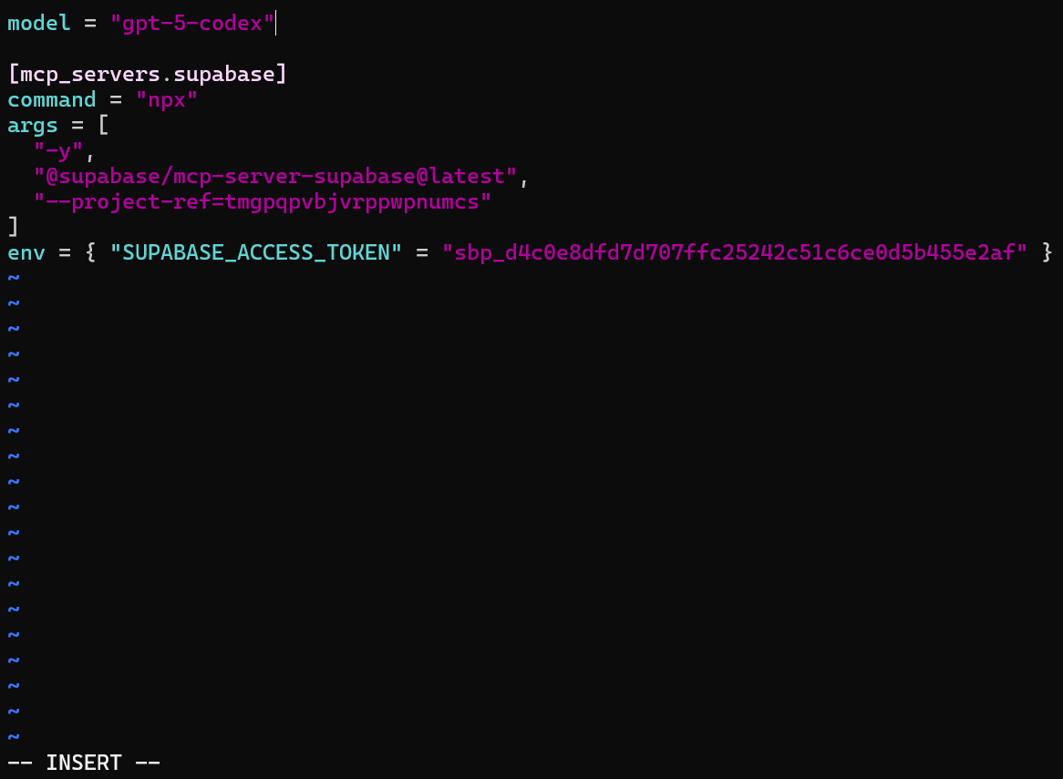 여기서 값을 추가해야 되는데 먼저 알아야될 것은 codex는 MCP 설정이 다르다고 합니다. 아래는 예시는 Supabase MCP입니다.