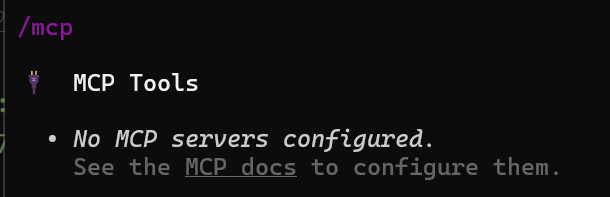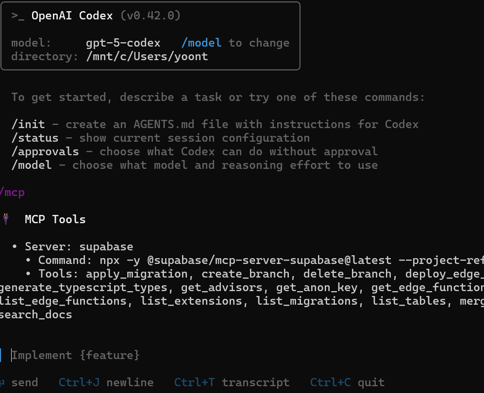 처음 codex를 사용하게 되면 MCP 연결이 안 되어 있는 것을 볼 수 있습니다.