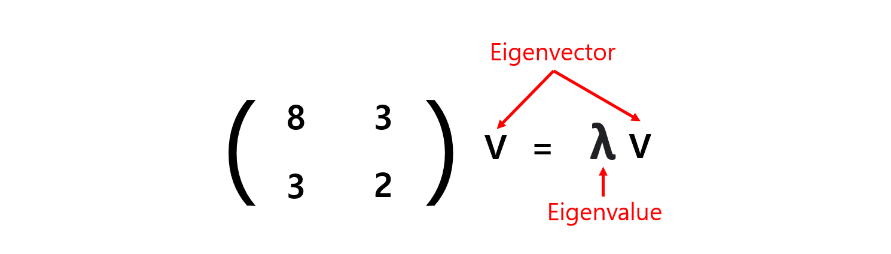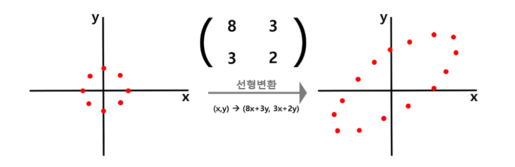 - Linear transform 후에 방향이 같은 vector가 Eigenvector, 길이 변화 비율이 Eigenvalue