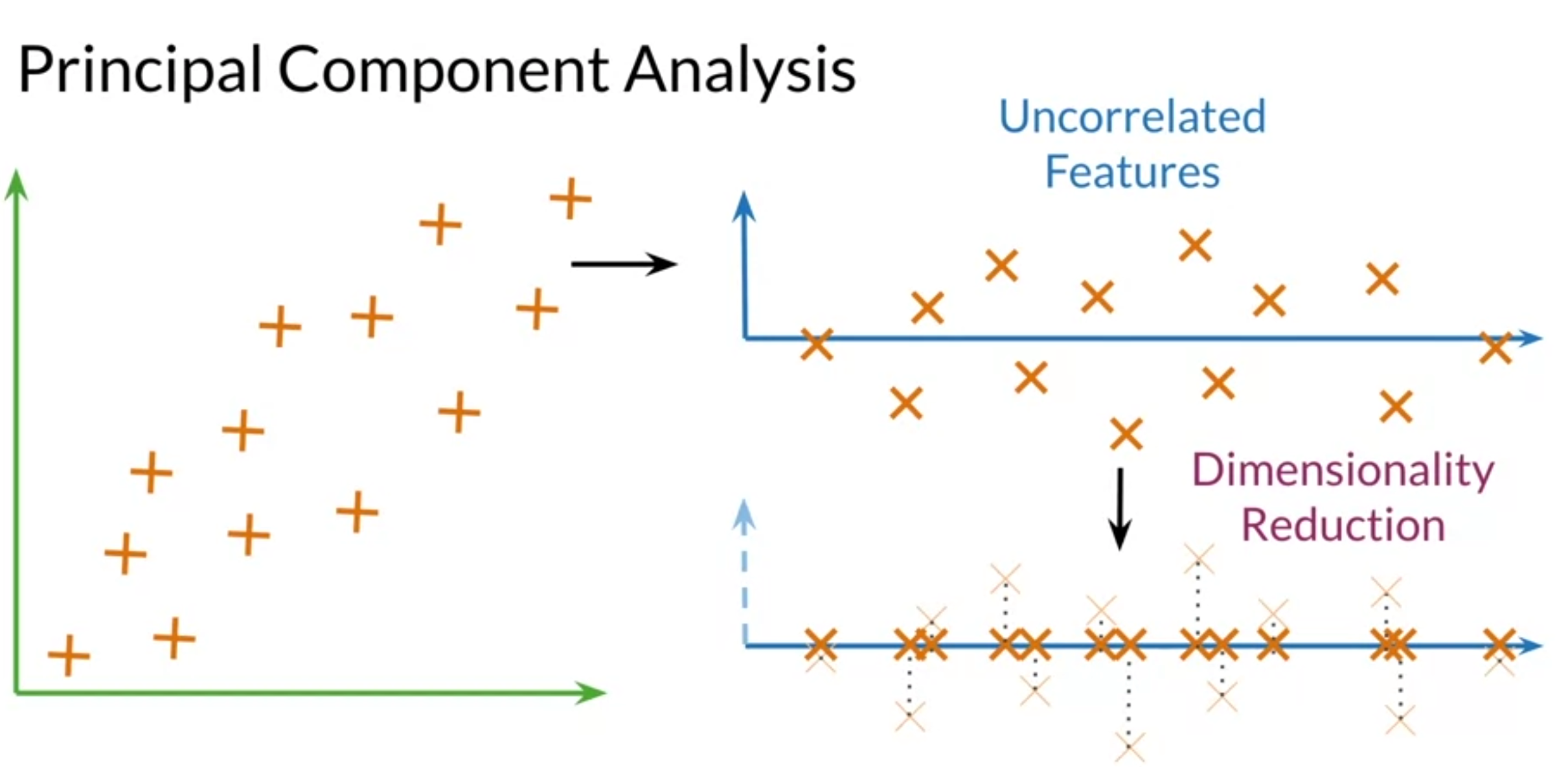 - PCA : algorithm used for dimensionality reduction that can find uncorrelated features for data