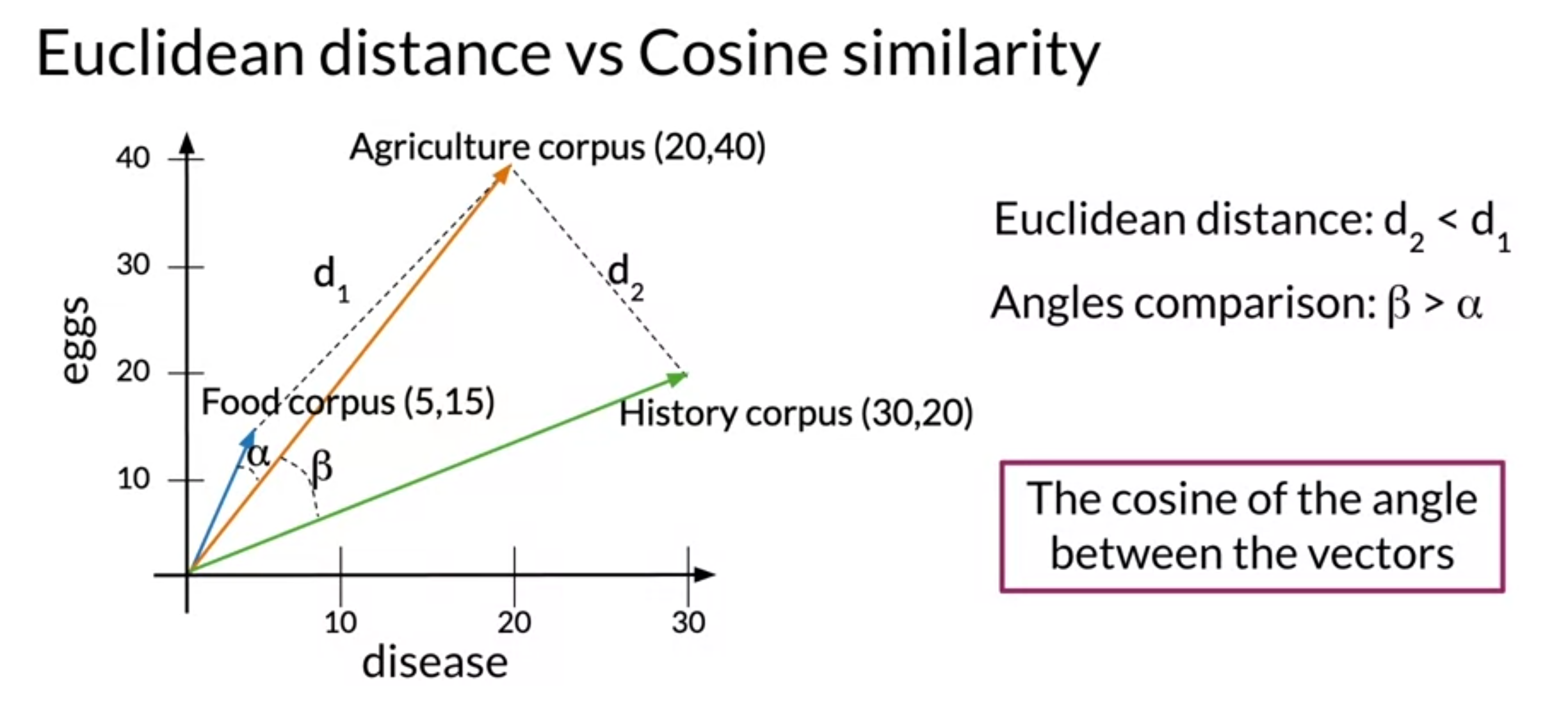 - Cosine similarity might overcome the problem of Euclidean distance