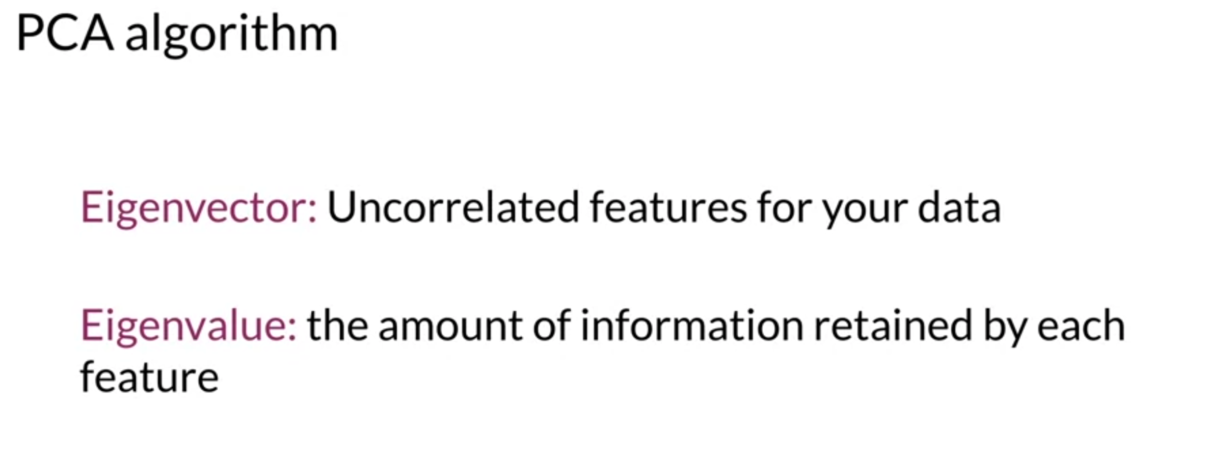 - Eigenvectors give directions of uncorrelated features and t he Eigenvalues are the variants of your data sets in each of those new features.