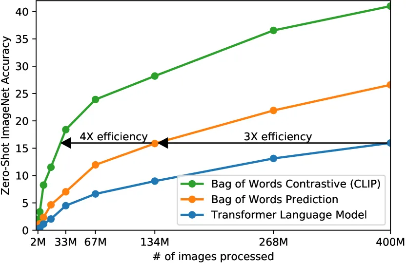 위의 그래프 처럼 대조적 접근은 이미지와 텍스트를 전체 문장 단위로 비교하므로, 개별 단어까지 정확히 맞출 필요 없이 이미지와 어울리는 문장인지 만을 판별하게 되어 학습 난이도를 낮추는 효과가 있었다고 한다. 그 결과 CLIP에서는 이미지-텍스트 일치 여부 예측이라는 간단한 프레임워크만으로도 고성능의 시각 표현 학습이 가능함을 보였다. 또한 거대한 데이터셋을 사용함으로써 모델이 과적합될 걱정이 적어, ImageNet 예측으로 초기화한다든지 복잡한 데이터 증강을 사용하는 등의 기법도 배제하여 구현을 단순화했다.