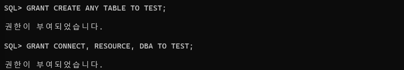 GRANT CREATE ANY TABLE TO TEST;