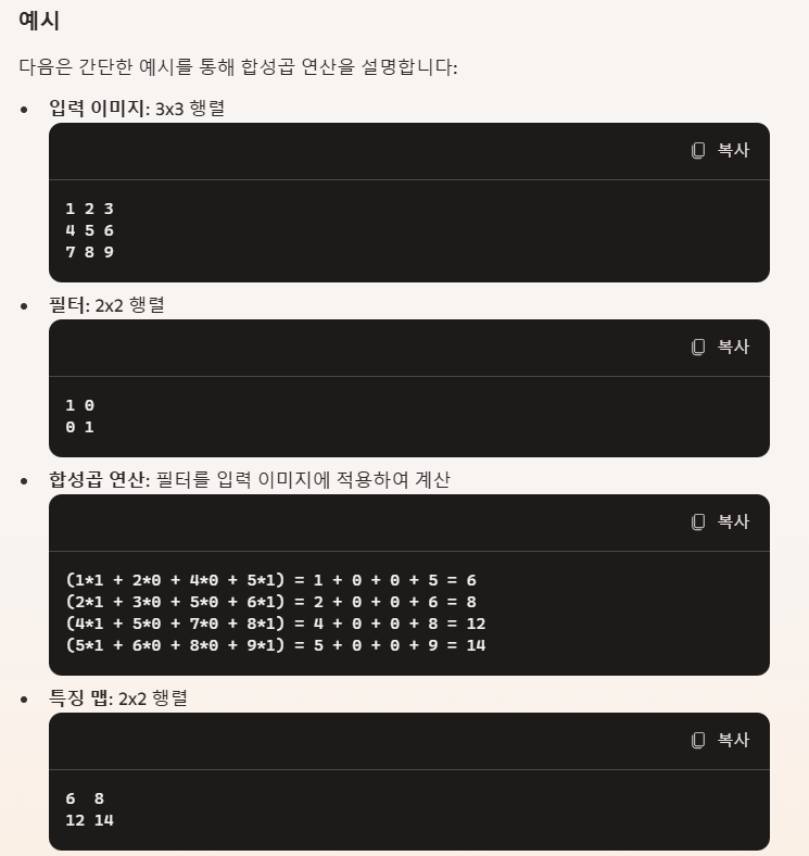 합성곱은 Convolutional Neural Network (CNN)에서 사용되는 주요 연산 중 하나로, 입력 이미지의 특정 특징을 추출하는 데 사용됩니다. 합성곱 연산은 필터(또는 커널)을 이미지에 적용하여 특징 맵을 생성합니다.