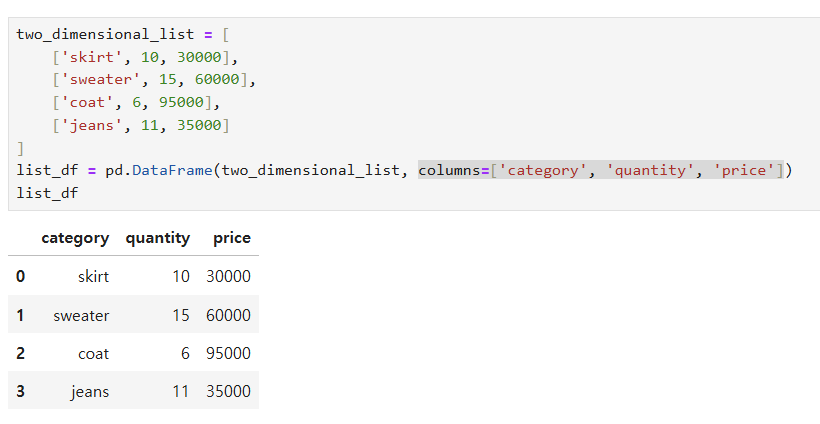 칼럼네임 삽입하기 : 옵션에 columns=[네임, 네임, 네임...] 삽입하기