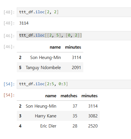 loc = location, 즉 위치값으로 데이터를 불러오는데 그 중에서 정수(i)값으로 불러온다. 대괄호 안에 세로열을 먼저 쓰고, 가로행을 쓴다. 그 정수 값들은 여러개를 리스트처럼 넣거나, 시리즈로 넣을수 있으며 그러면 또다른 데이터프레임 모양으로 만들어진다.
