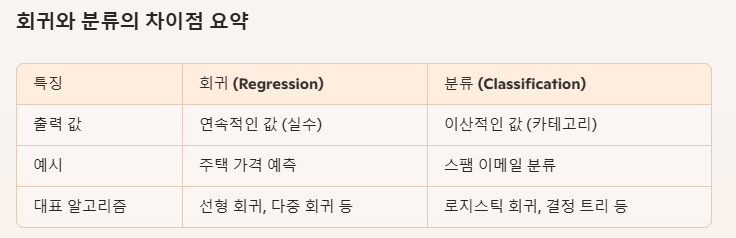 회귀는 연속적인 값을 예측하는 데 사용되는 통계 기법입니다. 예를 들어, 집의 크기와 가격 데이터를 가지고, 새로운 집의 크기를 입력받아 그 집의 가격을 예측하는 문제에 사용됩니다.