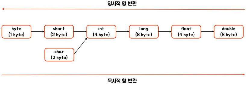 기본형의 자동 형변환이 가능한 방향은 위 그림과 같고, 반대 방향으로 형변환을 하고 싶다면 명시적 형변환을 직접 해줘야 한다.